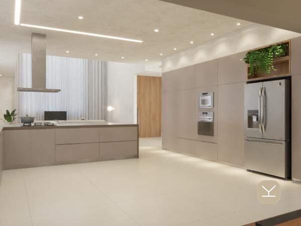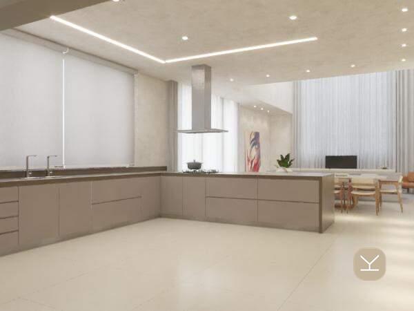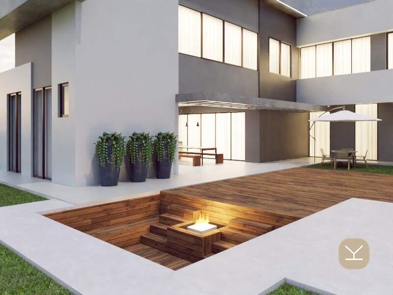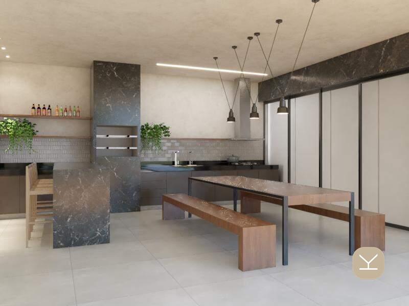O nível inferior da casa possui espaço gourmet, lavabo, fireplace e piscina.
